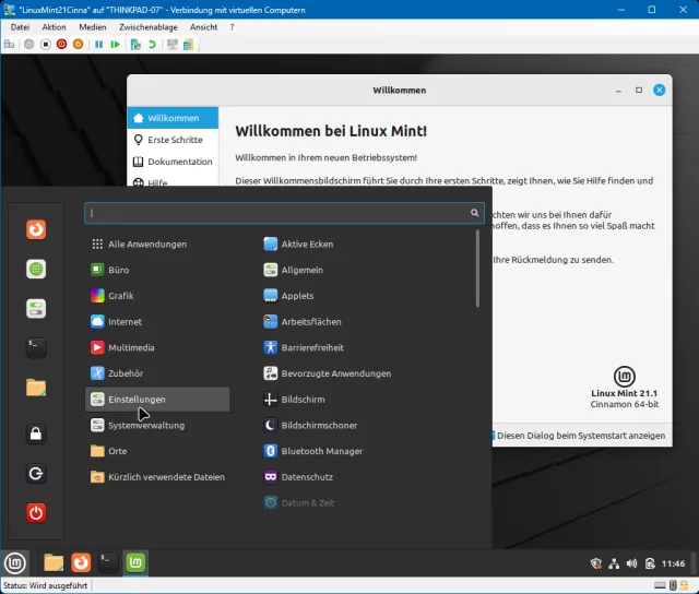 Zum Schluss klicken Sie auf Jetzt neu starten. Wichtig: Das System informiert Sie mit «Please remove the installation medium, then press ENTER» darüber, dass Sie den Installationsdatenträger entfernen sollen. Klicken Sie oberhalb der VM auf Medien/DVD-Laufwerk und benutzen Sie Auswerfen. Drücken Sie Enter, startet das System neu. Melden Sie sich mit dem vorhin gewählten Passwort an. Voilà, Ihr Linux Mint ist bereit! Unten rechts wird Ihnen ein oranger Punkt auf einem Schildsymbol stets anzeigen, wenn Updates bereitstehen. Klicken Sie sich auch durch die Tipps, die Ihnen das «Willkommen bei Linux Mint»-Fenster anbietet. Es führt Sie auch gleich durch ein paar Personalisierungs-Schritte.