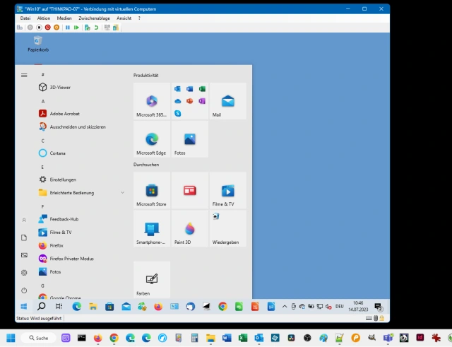 Ist die Installation abgeschlossen, können Sie darin tun, was Sie auch auf einem richtigen PC oder Notebook machen, auch ein Ausprobieren von Programmen ist kein Problem. Bedenken Sie einfach, dass die VM naturgemäss etwas langsamer reagiert als es ein richtiger PC würde. Besonders umfangreiche Anwendungen und sehr rechenintensive Arbeitsschritte werden darin zur Geduldsprobe. Ich würde zum Beispiel nicht versuchen, darin einen Koloss wie Adobe InDesign zu betreiben oder grössere Videodateien zu rendern. Öffnen Sie in der VM den Edge-Browser und laden Sie von Mozilla.org beispielsweise den Firefox herunter. Solcherlei Standard-Programme sind gar kein Problem. Die installierten Programme und gewählten Einstellungen bleiben getrennt vom sogenannten «Host» (mit Host, zu Deutsch «Gastgeber», ist Ihr richtiger PC gemeint).