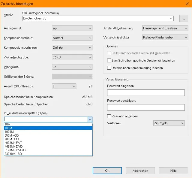 Aufteilen: Unten links finden Sie «In Teildateien aufsplitten». Das eignet sich für sehr grosse Archive, die Sie auf spezielle Datenträger verteilen müssen. So erstellt z.B. «650M – CD» Dateien von maximal 650 Megabyte, damit diese auf einer selbstgebrannten CD Platz hätten.