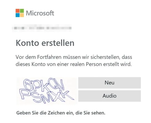 Quelle: PCtipp.chJetzt müssen Sie Ihre E-Mail-Adresse bestätigen. Dazu sendet Ihnen Microsoft eine Mail an die angegebene Adresse, die einen Code enthält, den Sie im Browserfenster eingeben. Jetzt klicken Sie auf Weiter. Zum Schluss bestätigen Sie durch Eingabe einer Zeichenkette (Captcha), dass Sie keine Maschine sind, Bild 2.