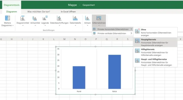 Eher umständlich ist die Formatierung von Diagrammen. Während man in der Bezahlversion viele Funktionen wie das Anpassen der Legenden, das Ein- und Ausblenden von Gitternetzlinien oder das Platzieren direkt über ein Kontextmenü bearbeiten kann, muss man in Excel Online die Funktionen im Reiter Diagramm zusammensuchen, Bild 6. Das Anpassen der Farben ist nur bei Formen möglich, im Diagramm gibt es lediglich die vorgeschlagenen Farben. Beim Benutzen von Funktionen verwendet Excel Online die englischen Bezeichnungen. Komplexere Funktionen wie Pivot-Tabellen sind nicht vorhanden.