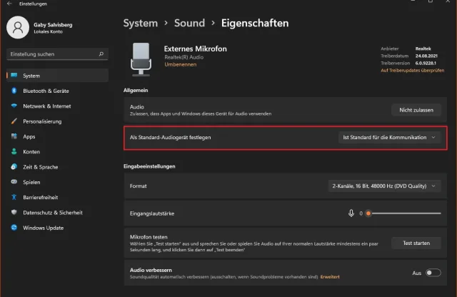 Öffnen Sie via Start/Einstellungen/System den Bereich Sound. Sie finden die Geräte getrennt in den Bereichen Ausgabe (zum Beispiel Lautsprecher, Kopfhörer) und Eingabe (beispielsweise Webcam-Mik und Headset-Mik). Möchten Sie für Kommunikation in erster Linie das externe Mikrofon nutzen, also zum Beispiel jenes im Headset? Jetzt Obacht: Klicken Sie rechts von Externes Mikrofon auf das Winkelsymbol. Bei Als Standard-Audiogerät festlegen wählen Sie Ist Standard für die Kommunikation, Bild 3. Soll Windows hingegen immer das Mikrofon der Webcam verwenden, wechseln Sie oben einen Schritt zurück und aktivieren das Mikrofon Ihrer Cam.