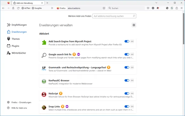 Ist es kein vergessenes Skript in NoScript, das Sie hätten zulassen sollen und hat das Löschen der Site-spezifischen oder der gesamten Cache- und Cookie-Daten nichts gebracht, dürfte es an einer Erweiterung liegen. Gehen Sie oben rechts übers Hamburgermenü zu Add-ons und Themes und klicken Sie in der linken Spalte auf Erweiterungen. Damit listet Firefox alle Add-ons auf, die installiert sind, angefangen mit jenen, die auch aktiviert sind. Kippen Sie bei allen Add-ons den hier blau dargestellten Schalter auf Aus, was sie zwar nicht deinstalliert, aber sofort deaktiviert. Prüfen Sie jetzt in einem neuen Tab, ob sich die störrische Seite laden lässt. Wenn ja, dann war eine dieser Erweiterungen schuld.