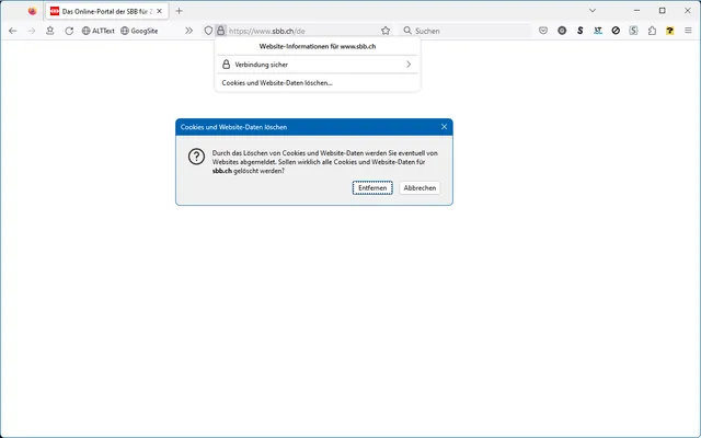 Manchmal blockiert eine defekte Datei im Cache das Laden einer Seite. In einem solchen Fall versucht man am besten gezielt die zugehörigen Dateien im Cache abzuräumen. Klicken Sie in der Adresszeile vor der Adresse aufs Schloss-Symbol und wählen Sie Cookies und Website-Daten löschen. Im Rückfrage-Pop-up sehen Sie, dass Firefox hiermit nur die Daten der gerade aufgerufenen Domain löschen wird, in diesem Fall sbb.ch. Klicken Sie auf Entfernen und drücken Sie anschliessend Ctrl+R, um die Seite neu zu laden.