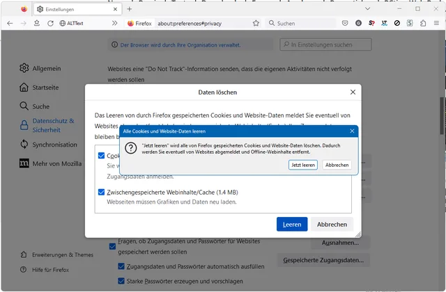 Öffnen Sie übers Hamburgermenü oben rechts die Einstellungen und gehen Sie zu Datenschutz & Sicherheit. Scrollen Sie herunter zu Cookies und Website-Daten, anschliessend klicken Sie auf Daten entfernen. Haken Sie beide Optionen an: Cookies und Website-Daten sowie Zwischengespeicherte Webinhalte/Cache. Klicken Sie auf Leeren, gefolgt von Jetzt leeren.