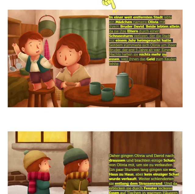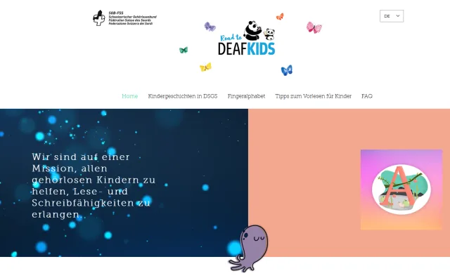 Sie finden auf der Webseite deafliteracy.ch unter anderem Kindergeschichten in DSGS (Deutschschweizerische Gebärdensprache), z. B. «Die magische Tasche», das Fingeralphabet sowie Tipps zum Vorlesen für Kinder.