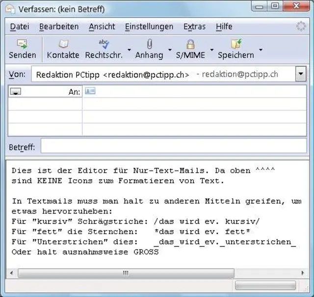 Quelle: PCtipp.chHier haben Sie eigentlich keine Gestaltungsmöglichkeiten. Manche Mailprogramme (so auch Thunderbird) interpretieren jedoch ein in /Schrägstriche/ gestelltes Wort als kursiv und ein in *Sternchen* gefasstes Wort als fett.