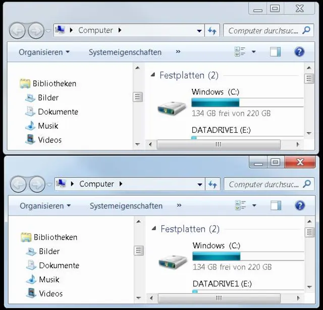 Quelle: PCtipp.chIn Windows 7 ist beim Fenster ohne Fokus (oben) ebenfalls die Farbe der Titelleiste etwas weniger kräftig. Ausserdem erkennen Sie es klar am 3D-Effekt und der roten Farbe der Fenstersymbole in der oberen rechten Ecke: Trägt ein Fenster das Schliessen-X auf einem roten Feld, ist es das aktive Fenster.
