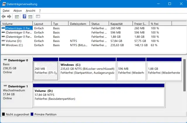 Darunter ist Datenträger 1 mit 57,84 GB aufgeführt. Weil keine anderen Laufwerke verbunden sind, weil die Grösse stimmt und weil «Wechseldatenträger» steht, muss dies offensichtlich der USB-Stick sein. Als dieser Screenshot entstand, waren die unerwünschten Partitionen schon weg.