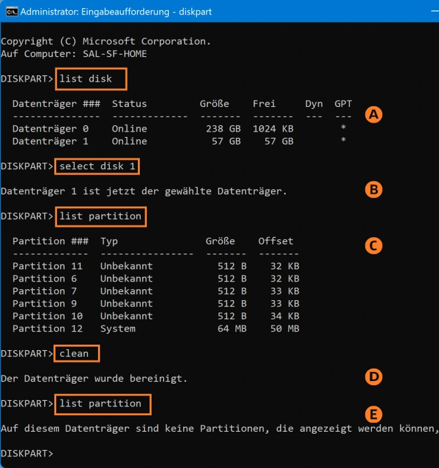 Alle abräumen: Tippen Sie clean ein und drücken Sie Enter, erscheint die Meldung «Der Datenträger wurde bereinigt», siehe (D). Wenn Sie nun nochmals list partition verwenden, wird Ihnen Diskpart melden, dass sich keine Partitionen auf diesem Datenträger befinden (E).