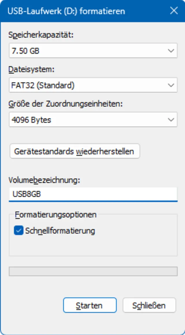Spätestens jetzt wird sich wohl auch bei Ihnen der Windows-Explorer melden. Windows versucht, die frisch erstellte Partition automatisch ins Dateisystem einzuhängen. Dabei stellt es jedoch fest, dass diese über kein Dateisystem verfügt, weil sie noch nicht formatiert worden ist. Das meldet Ihnen Windows mit einem Pop-up, in welchem es Ihnen das Formatieren anbietet. Nehmen Sie das Angebot an, erscheint der Formatierdialog. Wählen Sie ein Dateisystem. Für kleinere Sticks, wie wir hier einen als zweites Beispiel haben, tuts in der Regel FAT32, sofern Sie keine Dateien grösser als 4 GB darauf ablegen wollen. Ansonsten greifen Sie zu NTFS oder exFAT. Tipps dazu finden Sie auch in diesem Artikel. Vergeben Sie dem Stick im Feld Volumebezeichnung einen einfachen Namen; vielleicht gerade einen, der auch die Grösse angibt, zum Beispiel USB8GB. Nach dem Klick auf Starten wird der Stick formatiert und wird kurz darauf im Explorer als leeres, benutzbares Laufwerk auftauchen.