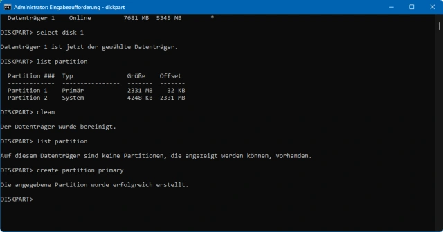 Partition erstellen: Haben Sie vorhin mittels clean alle Partitionen abgeräumt, müssen Sie wieder eine erstellen. Benutzen Sie hierfür den Befehl create partition primary und drücken Sie Enter. Dies erstellt eine normale Partition, welche den gesamten Platz des USB-Speichers belegt.