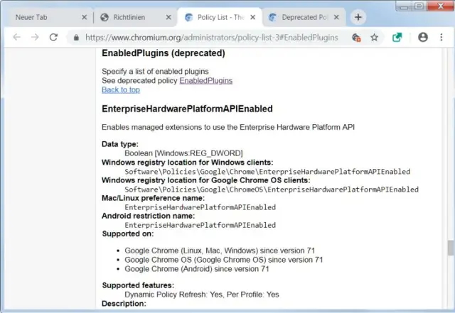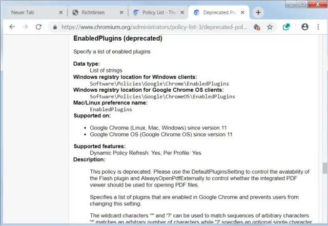 Quelle: PCtipp.chDer Klick auf den Link bei «See deprecated policy EnabledPlugins» führt zu einer genaueren Beschreibung. Die hier vorgefundene Richtlinie scheint schon länger veraltet zu sein und steht vermutlich schon seit längerer Zeit ungenutzt da. Sie diente damals zum Steuern von Flash und PDF. In der Detailbeschreibung finden sich auch die Registry-Pfade, in denen die Richtlinie seinerzeit eingetragen wurde.