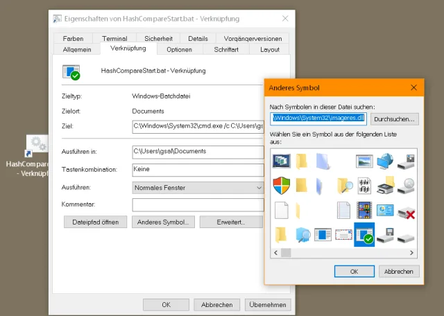 Klicken Sie mit rechts auf die Verknüpfung und wählen Sie Eigenschaften. Im Reiter Verknüpfung klicken Sie ins Feld Ziel. Hüpfen Sie per Home-Taste ganz an den Anfang des Feldes. Dort fügen Sie die Zeichenfolge C:\Windows\System32\cmd.exe /c sowie ein Leerzeichen ein, damit der ganze Inhalt des Ziel-Feldes ungefähr wie folgt lautet, wobei anstelle von «IhrName» natürlich der Name Ihres Windows-Benutzerprofils gemeint ist: C:\Windows\System32\cmd.exe /c C:\Users\IhrName\Documents\HashCompareStart.bat