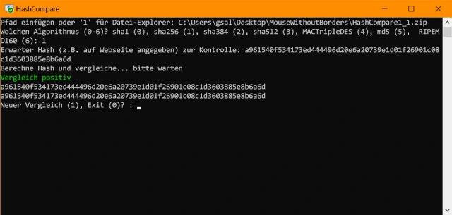 Ab sofort gehts wie folgt: Klicken Sie aufs HashCompare-Icon. Es erscheint ein Konsolenfenster. Hier müssen Sie aber keine langen Befehle eintippen, sondern einfach die jeweils passende Ziffer. Zuerst erscheint «Pfad einfügen oder '1' für Datei-Explorer». Das bedeutet: Drücken Sie die Ziffer 1 und wählen Sie die zu prüfende Datei via Explorer-Fenster aus. Anschliessend können Sie per Eintippen der zugehörigen Ziffer aus einem von sieben Algorithmen wählen: