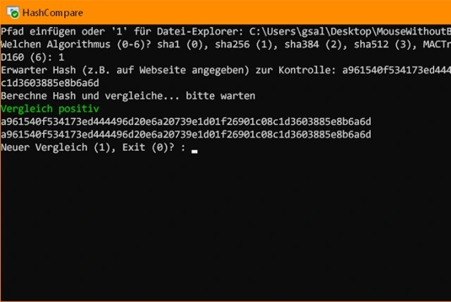 #Compare hash of downloaded files#Author: Xpert for PCtipp 02/2020#Version 1.1 05.03.2020function Restart(){$restart = Read-Host -Prompt "Neuer Vergleich (1), Exit (0)? "if($restart -match 0){exit}HashCompare}function HashCompare(){    Add-Type -AssemblyName System.Windows.Forms$choosePathOption = ""cls#Algorithms to choose from$const_sha1 = "sha1"$const_sha256 = "sha256"$const_sha384 = "sha384"$const_sha512 = "sha512"$const_MACTripleDES = "MACTripleDES"$const_md5 = "md5"$const_RIPEMD160 = "RIPEMD160"    $FileBrowser = New-Object System.Windows.Forms.OpenFileDialog -Property @{ InitialDirectory = [Environment]::GetFolderPath('Desktop') }$choosePathOption = Read-Host -Prompt "Pfad einfügen oder '1' für Datei-Explorer"if($choosePathOption -match '1'){$null = $FileBrowser.ShowDialog()$pathToFile = $FileBrowser.FileName }else{$pathToFile = $choosePathOption}$ChooseAlgorithmToUse = Read-Host -Prompt "Welchen Algorithmus (0-6)? $const_sha1 (0), $const_sha256 (1), $const_sha384 (2), $const_sha512 (3), $const_MACTripleDES (4), $const_md5 (5),  $const_RIPEMD160 (6)"     switch ( $ChooseAlgorithmToUse )    {        0 { $AlgorithmToUse = "sha1"    }        1 { $AlgorithmToUse = "sha256"    }        2 { $AlgorithmToUse = "sha384"   }        3 { $AlgorithmToUse = "sha512" }        4 { $AlgorithmToUse = "MACTripleDES"  }        5 { $AlgorithmToUse = "md5"    }        6 { $AlgorithmToUse = "RIPEMD160"  }    }$pathToFile = $pathToFile -replace ('"', '')$hashExpected = Read-host -Prompt "Erwarteter Hash (z.B. auf Webseite angegeben) zur Kontrolle"    Write-Host "Berechne Hash und vergleiche... bitte warten"$hashFromFile = get-filehash -path $pathToFile -Algorithm $AlgorithmToUse | Select -ExpandProperty "Hash"if($hashExpected -match $hashFromFile){Write-Host "Vergleich positiv" -ForegroundColor GreenWrite-host $hashExpected.ToLower() Write-Host $hashFromFile.ToLower()Restart}Write-Host "Vergleich negativ" -ForegroundColor RedWrite-host $hashExpected.ToLower()Write-Host $hashFromFile.ToLower()Restart}HashCompare