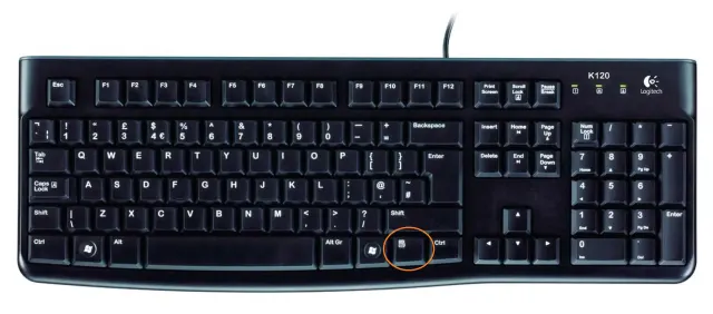 Die Kontextmenü-Taste (falls vorhanden) befindet sich häufig unten rechts neben der Leertaste, zwischen der dortigen Windows- und der Ctrl-Taste.