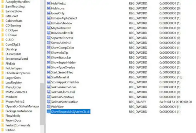 Löschen Sie dort in der rechten Fensterhälfte den Eintrag ShowSecondsInSystemClock und starten Sie den Windows-Explorer wie oben beschrieben neu.