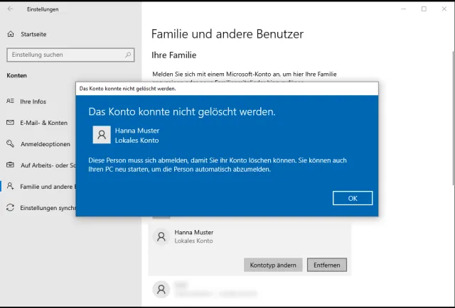 Jedenfalls schlägt Windows als Abhilfe einen Neustart vor; danach könnte man das Konto löschen. Es geht mit diesem Tipp aber auch ohne Neustart.