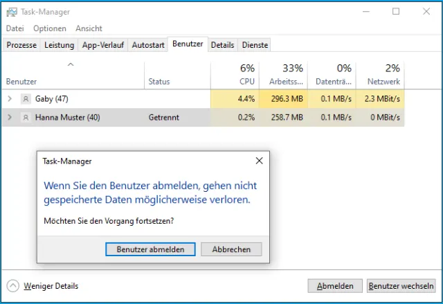 Lösung: Öffnen Sie mit Ctrl+Shift+Esc (Strg+Umschalt+Esc) oder nach einem Rechtsklick auf die Taskleiste den Task-Manager. Klicken Sie bei Bedarf auf Mehr Details. Wechseln Sie zum Reiter Benutzer. Hier sehen Sie alle aktuell angemeldeten Benutzerkonten. Klicken Sie das auszuloggende Konto an (hier: Hanna Muster) und verwenden Sie unten die Schaltfläche Abmelden.