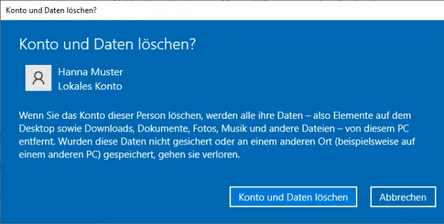 Diesmal dürfen Sie das Konto löschen; Windows fragt nur noch danach, ob auch die zugehörigen Daten wegdürfen