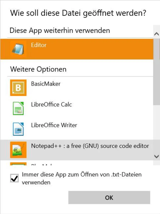 Normalerweise ginge das so: Rechtsklick auf eine Textdatei, Öffnen mit/Andere App auswählen. Man hakt nun erst Immer diese App zum Öffnen von .txt-Dateien verwenden an, geht via Weitere Apps zu Andere App auf diesem PC suchen und klickt sich via C:\Programme\ zum Ordner Notepad++ durch, indem man notepad++.exe und Öffnen anklickt. Die Datei öffnet sich in Notepad++ und ab jetzt sollten sich alle .txt-Dateien in diesem Programm öffnen. Schön wärs!