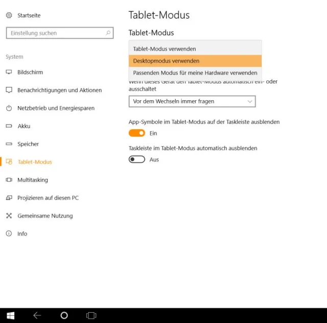 Klicken oder tippen Sie aufs Startmenü-Icon oder tippen Sie einmal unten links ins Suchfeld. Tippen Sie Tabletmoduseinstellungen ein und starten Sie die gefundene Einstellungsoption. Klappen Sie bei Tablet-Modus das Menü auf und wählen Sie entweder Desktopmodus verwenden oder Passenden Modus für meine Hardware verwenden.
