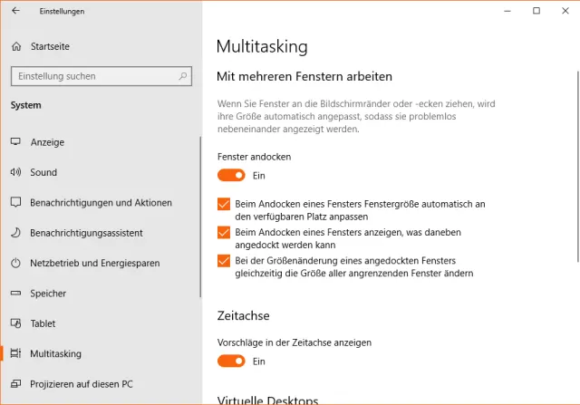 Die Einstellungen von Windows 10 bieten nur eine einzige, leider sehr rigorose Option. Öffnen Sie Start/Einstellungen (Zahnrad-Symbol) und gehen Sie via System zu Multitasking. Die Aero Shake-Funktion werden Sie nur los, wenn Sie hier den Schalter «Fenster andocken» auf Aus kippen.
