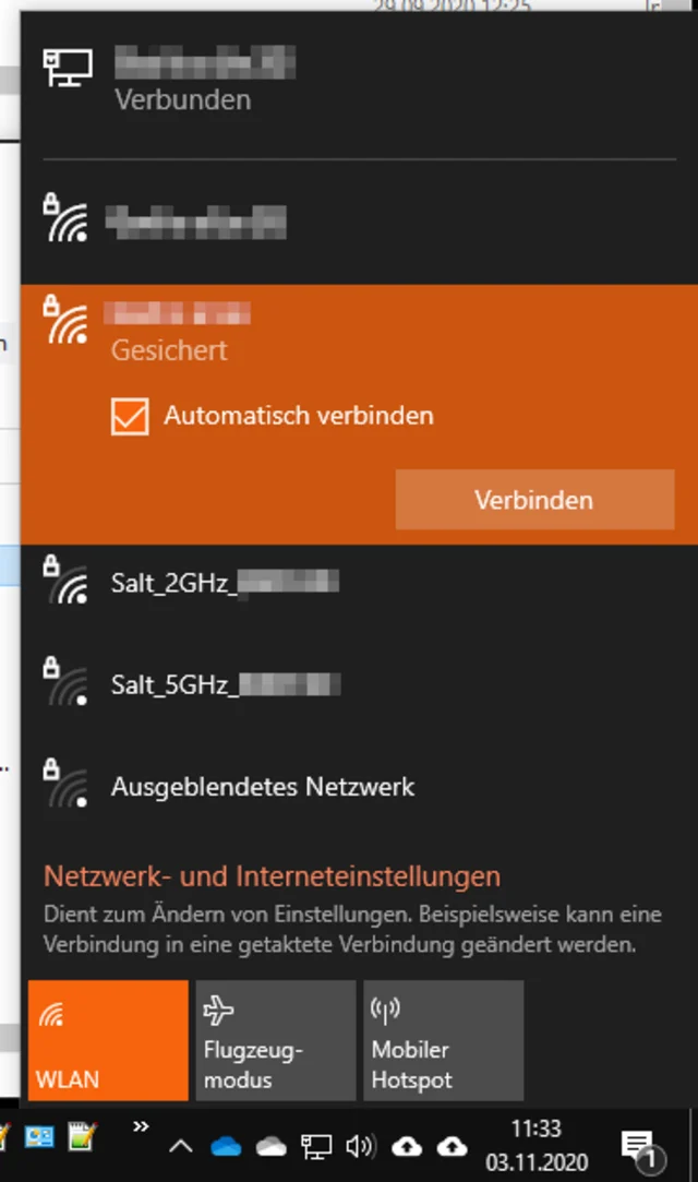 Nach dem Einschalten bzw. Aufwecken des PCs oder Notebooks dauert es bei manchen Geräten sehr lange, bis sie wieder Netzwerk- bzw. Internetzugriff haben. Manchmal muss man sich sogar manuell wieder mit dem WLAN verbinden. Falls letzteres auftritt, klicken Sie aufs WLAN- bzw. Netzwerk-Icon unten rechts im Infobereich. Klicken Sie auf Ihr Netzwerk. Stellen Sie sicher, dass Automatisch verbinden aktiv ist.