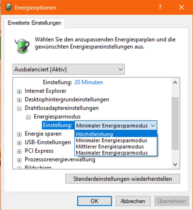 Klicken Sie auf Start, tippen Sie energie ein und öffnen Sie Einstellungen für Netzbetrieb und Energiesparen. Unter Verwandte Einstellungen gehts zu Zusätzliche Energieeinstellungen (alternativen Weg hierhin: Windowstaste+R, Eintippen von control powercfg.cpl). Anschliessend klicken Sie hinter dem aktuellen Energiesparplan auf Energiesparplaneinstellungen ändern. Der nächste Klick gilt Erweiterte Energieeinstellungen ändern. Klappen Sie Drahtlosadaptereinstellungen auf und darin Energiesparmodus. Sollte Mittlerer Energiesparmodus oder Minimaler Energiesparmodus nicht helfen, versuchen Sie es mit dem Eintrag Höchstleistung. Damit wird das Gerät aber mehr Strom brauchen, während es gar nicht verwendet wird.