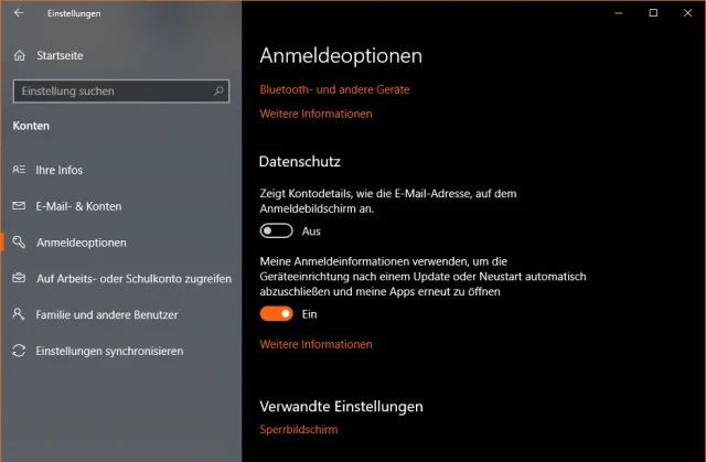 Für die zuletzt geöffneten Programme gehts zu Start/Einstellungen. Sie finden das Gesuchte überraschenderweise unter Konten in den Anmeldeoptionen. Scrollen Sie da ganz nach unten, bis Sie zu Datenschutz gelangen.