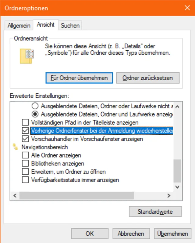 Quelle: pctipp.chNebst Ihren Office- oder Browserfenstern hätten Sie vielleicht beim Start auch gleich Ihre zuletzt genutzten Ordnerfenster griffbereit. Das ist eine Einstellung im Datei-Explorer. Gehen Sie im Explorer im Reiter Ansicht via Optionen zu Ordner- und Suchoptionen ändern. Im Reiter Ansicht scrollen Sie in der Liste ungefähr bis zu «Versteckte Dateien und Ordner» herunter. Eine der Optionen unterhalb heisst Vorherige Ordnerfenster bei der Anmeldung wiederherstellen. Aktivieren Sie diese und klicken Sie auf OK.