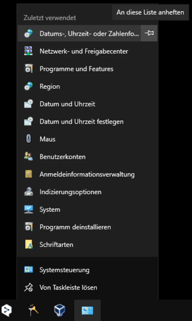 Quelle: PCtipp.chTaskleistenverknüpfung, Variante 1: In die Taskleiste können Sie das oben erstellte Icon übrigens nicht direkt stecken. Hierfür gibts eine andere Lösung. Starten Sie die Systemsteuerung und heften Sie diese an die Taskleiste an, indem Sie mit rechts auf deren Taskleisten-Symbol klicken und An Taskleiste anheften wählen. Ab sofort tut's ein Rechtsklick auf das Systemsteuerungs-Icon, denn im Kontextmenü werden automatisch die kürzlich verwendeten Systemsteuerungs-Objekte aufgelistet. Was Sie häufig brauchen, können Sie hier auch festpinnen. Fahren Sie hierfür per Maus z.B. über Datums-, Uhrzeit- oder Zahlenformat und klicken Sie auf die Stecknadel für An diese Liste anheften.