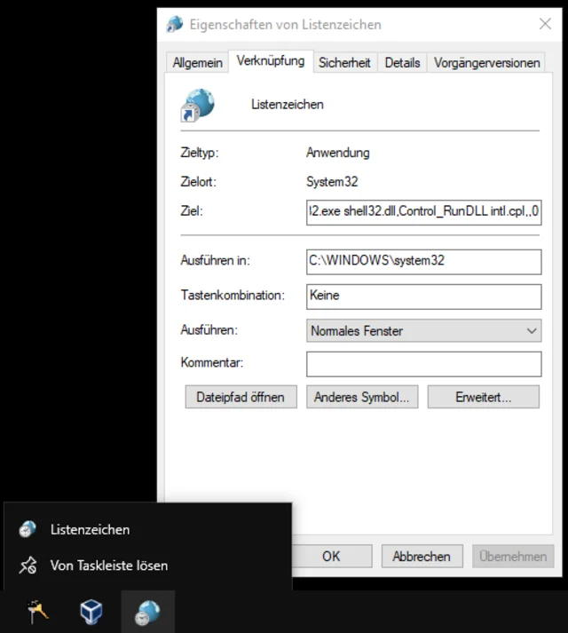 Ein Workaround, um eine Verknüpfung zu den Zahlenformaten direkt in die Taskleiste zu stecken