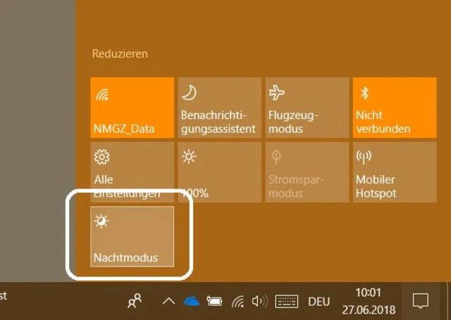 - Klicken Sie auf die Kachel Nachtmodus, um die Funktion zu aktivieren (und nochmals, um sie wieder zu deaktivieren).