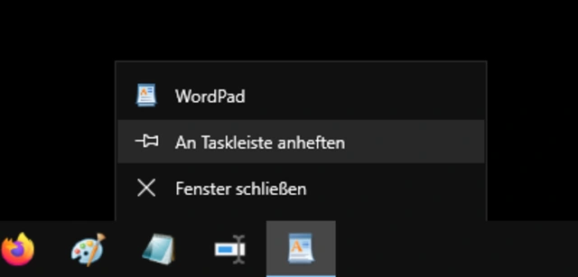Starten Sie WordPad. Klicken Sie mit rechter Maustaste auf sein Icon in der Taskleiste und wählen Sie An Taskleiste anheften; natürlich nur, sofern Sie es dort nicht sowieso bereits angeheftet haben.