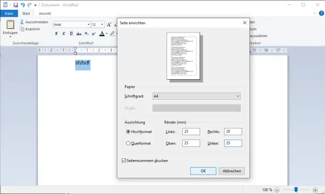 Im leeren WordPad-Fenster tippen Sie provisorisch ein paar Zeichen ein, z.B. test. Drücken Sie Ctrl+A (Strg+A), um diese zu markieren. Wählen Sie nun oben die gewünschte Standardschriftart (z.B. Arial) und die gewünschte Standardschriftgrösse, zum Beispiel 12. In Ihrem Standarddokument möchten Sie vielleicht auch gleich die Seitenränder nach Ihrem Geschmack einrichten. Gehen Sie zu Datei/Seite einrichten. Passen Sie unten die Angaben für Ihre bevorzugten Seitenränder in Millimetern an (z.B. 25 Millimeter für 2,5 Zentimeter). Klicken Sie auf OK. Wenn Sie mögen, können Sie auch den Standardzeilenabstand ändern. Klicken Sie im Menüband im Bereich Absatz auf das Absatz-Symbol mit dem (¶-Zeichen) und legen Sie bei Zeilenabstand beispielsweise 1.00 fest.