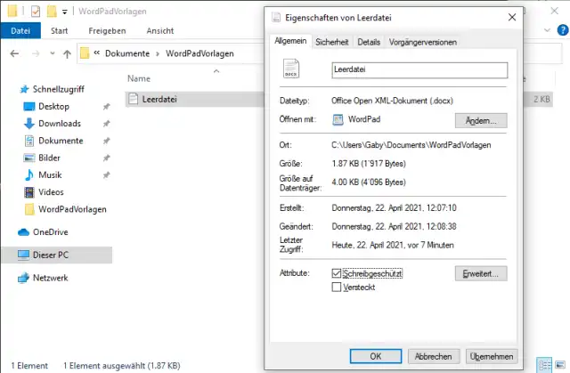 Speichern Sie die Datei in Ihrem Ordner WordPadVorlagen mit einem Namen wie WordPadBrief. Versehen Sie die Datei – wie Sie es schon bei der Leerdatei getan haben – mit einem Schreibschutz: im Explorer ein Rechtsklick darauf, Eigenschaften öffnen und Schreibgeschützt aktivieren.