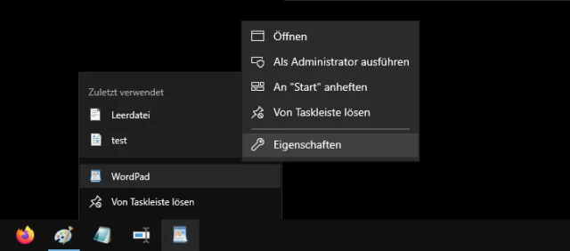 Und wie bringen Sie WordPad jetzt dazu, beim Öffnen standardmässig Ihre Leerdatei zu benutzen? Das erreichen Sie, indem Sie ihm das in Ihrer Taskleisten-Verknüpfung so mitteilen. Klicken Sie daher mit rechts auf die WordPad-Verknüpfung in der Taskleiste. Im Kontextmenü erscheint wieder WordPad; auch hier klicken Sie mit rechter Maustaste drauf und wählen Eigenschaften.