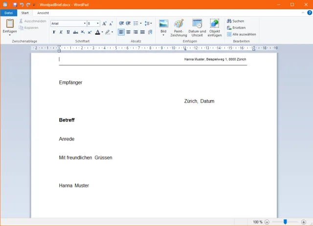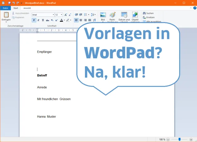 Das funktioniert nach einem sehr ähnlichen Prinzip, aber ein ganzes Stückchen einfacher. Erstellen Sie in WordPad zum Beispiel eine Briefvorlage, die Sie mitsamt Seitenrändern, Schriftarten und sogar Tabulatoren so gestalten, dass Sie später nur noch an den richtigen Stellen die fehlenden Informationen eintippen müssen. Etwa so, wie im folgenden Screenshot.
