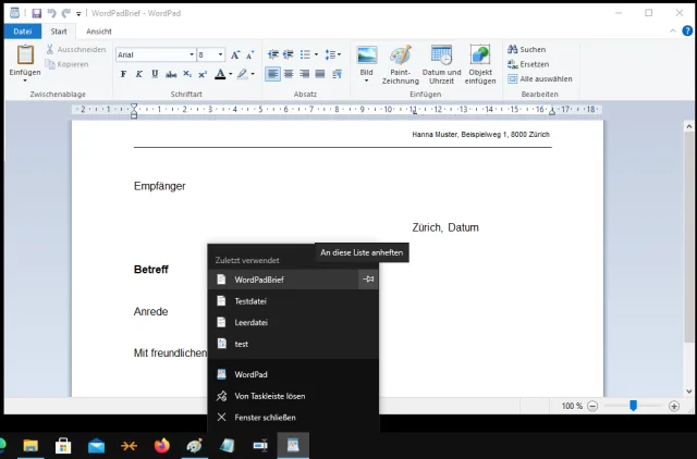 Öffnen Sie die Datei wieder in WordPad. Klicken Sie mit der rechten Maustaste aufs WordPad-Symbol in der Taskleiste. Im Kontextmenü sehen Sie Ihre Datei WordPadBrief unter Zuletzt verwendet. Fahren Sie rechts des Dateinamens aufs Stecknadelsymbol für An diese Liste anheften und klicken Sie es an.