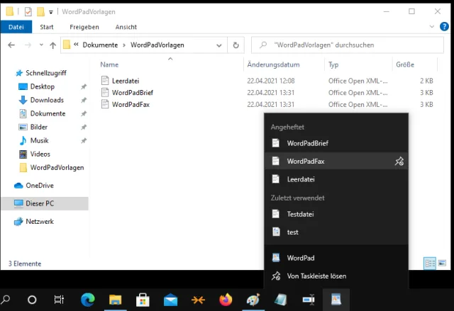 Die Vorlagendateien sind jetzt angeheftet und lassen sich nach einem Rechtsklick aufs WordPad-Symbol direkt verwenden