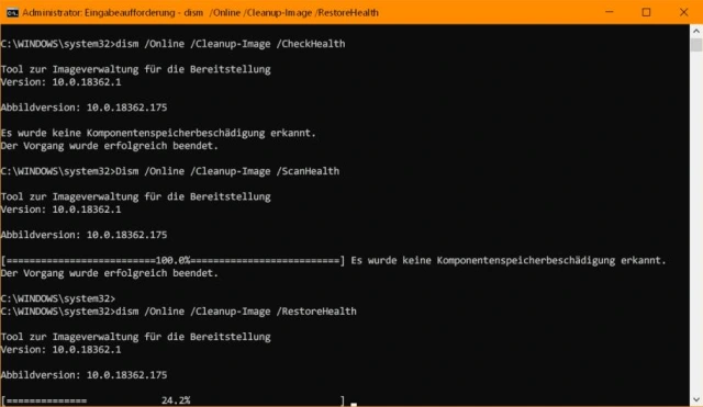 Das repariert bzw. ersetzt auch beschädigte Systemdateien, die vom System File Checker nicht repariert werden können. Hierfür nimmt DISM auch Windows-Update zu Hilfe, damit die korrekten Dateien in der aktuellen Version auf der Platte landen.