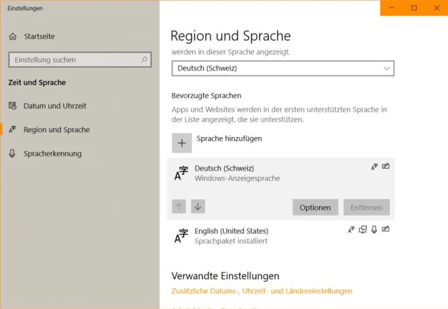 Falls das DEU/DE-Icon (oder EN oder FR) fehlt, drücken Sie die Windowstaste und öffnen Sie die Einstellungen. Via Zeit und Sprache gehts zu Region und Sprache. Wählen Sie im Sprachen-Ausklappmenü die gewünschte Windows-Anzeigesprache aus, zum Beispiel Deutsch (Schweiz).