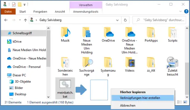 Mit einer Verknüpfung gehts dennoch. Angenommen, Ihre Batch-Datei heisst meinbatch.bat und liegt in C:\Users\Ihr Name\. Ziehen Sie von Ihrer Batch-Datei eine Verknüpfung irgendwo hin, indem Sie die Datei mit rechter Maustaste bewegen und beim Loslassen Verknüpfung hier erstellen wählen; Sie können die Verknüpfung auch gleich neben meinbatch.bat erzeugen.
