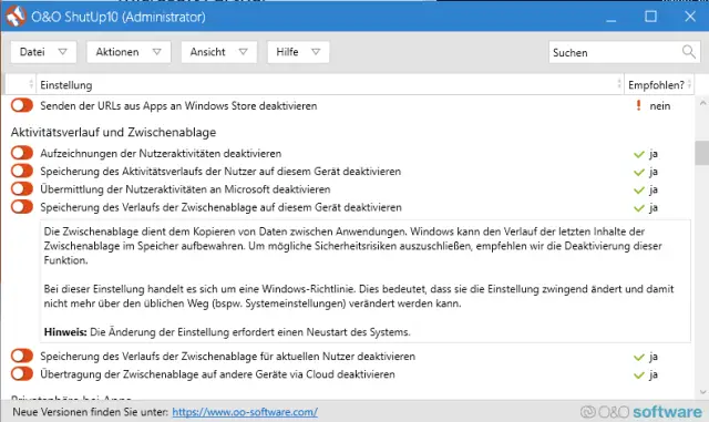 Quelle: PCtipp.chLiegt es an einem Tuning-Tool? Nicht nur Sicherheitssuites, sondern auch manche Tuning-Tools könnten die Sperre des Zwischenablageverlaufs verursachen. So gibt es beispielsweise von O&O ein Tool namens ShutUp10, in dem sich etliche aus Privatsphärensicht potentiell heikle Funktionen in Windows 10 ausschalten lassen. Der Zwischenablageverlauf ist ein Teil davon. Falls Sie ein solches Tool benutzt haben, prüfen Sie auch da die Einstellungen und ändern Sie diese gegebenenfalls wieder zurück.