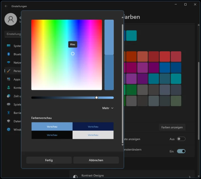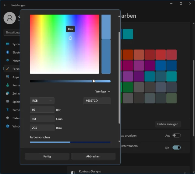 Windows 11: (Fast) exakt gewünschte Farbe im Fensterrahmen