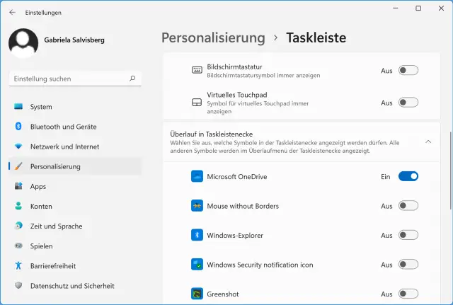 Hinweis: Der klassische, etwas umständliche Weg geht aber auch immer noch. Gehen Sie zu Start/Einstellungen (Zahnrad-Symbol) und darin zu Personalisierung. Im rechten Teil öffnen Sie den Bereich Taskleiste. Klicken Sie auf Überlauf in Taskleistenecke, lassen sich die dort anzuzeigenden Symbole per Kippschalter ein- oder ausknipsen.