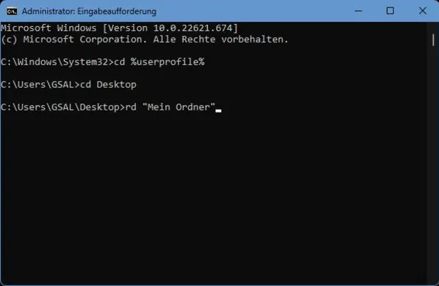 - Tippen Sie nun rd Ordnername (anstelle von «Ordnername» geben Sie den Namen des Ordners ein) und drücken Sie Enter. Hinweis: Falls der Ordnername ein Leerzeichen enthält, müssen Sie ihn in Anführungs- und Schlusszeichen setzen (z. B. rd "Mein Ordner")