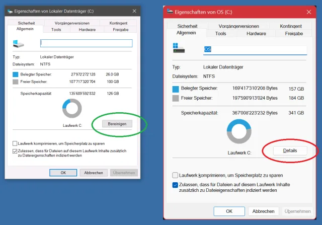 Ein Rechtsklick aufs Laufwerk C, gefolgt von Eigenschaften förderte in Windows 10 und früheren Windows-11-Versionen auch den Reiter Allgemein zutage, mit einem Button Bereinigen. Doch inzwischen finden Sie dort in Windows 11 an dessen Stelle eine Schaltfläche Details.